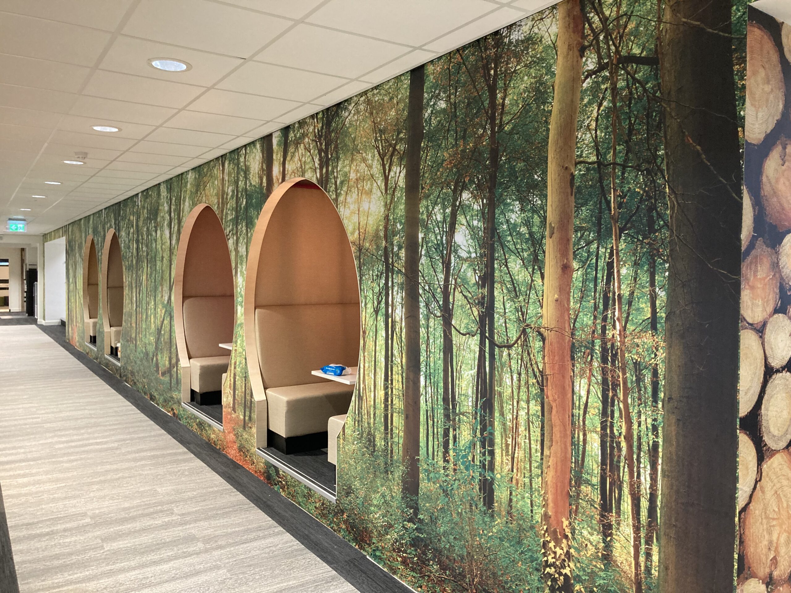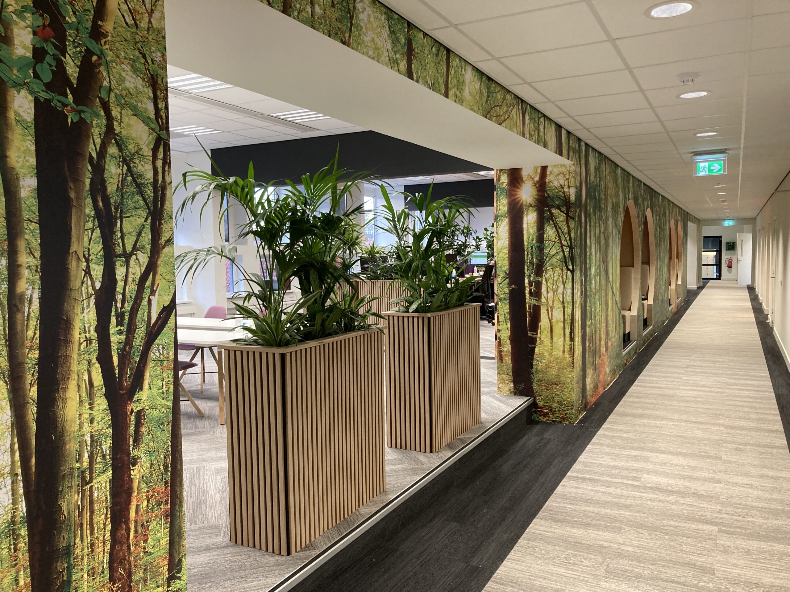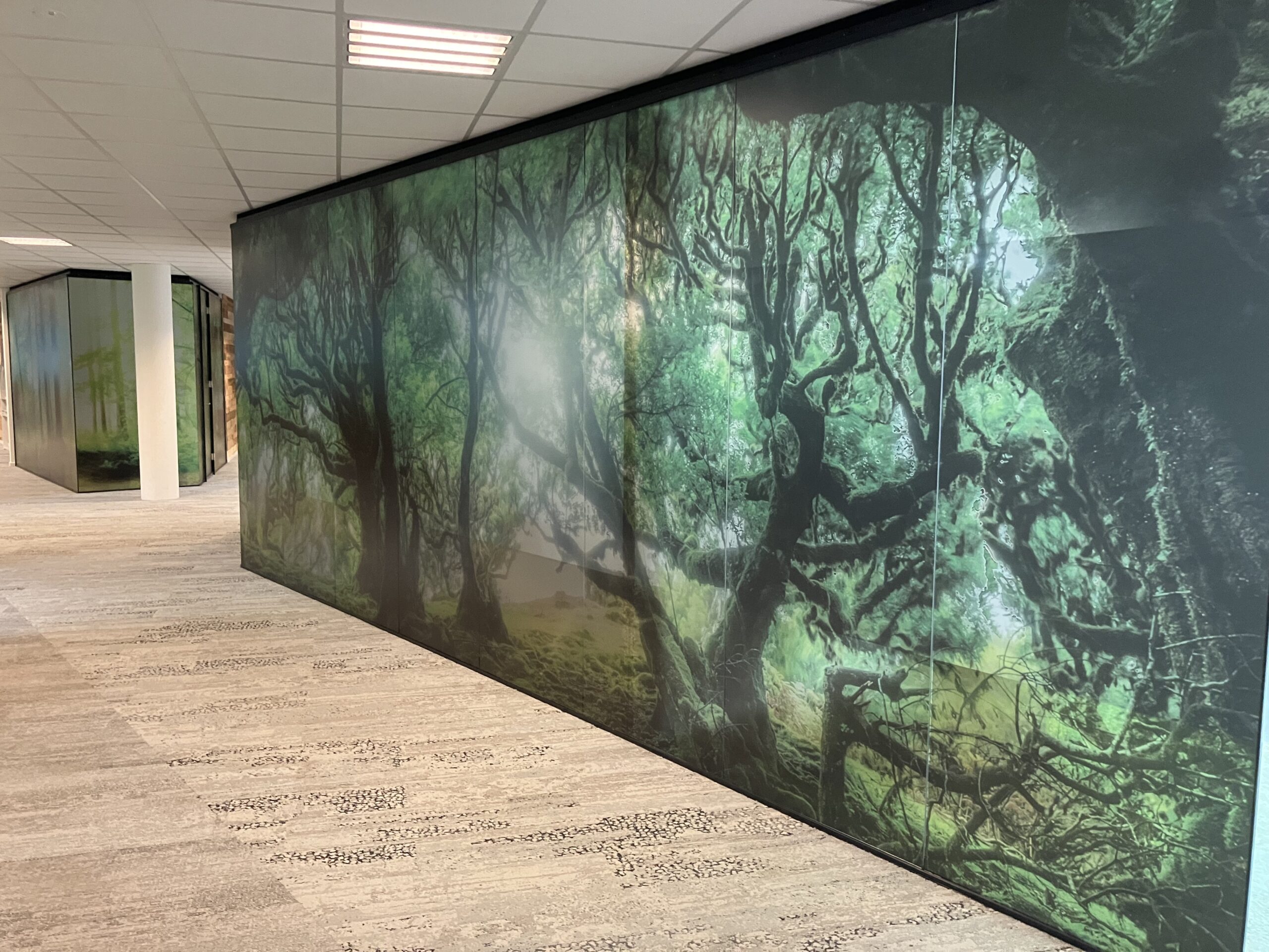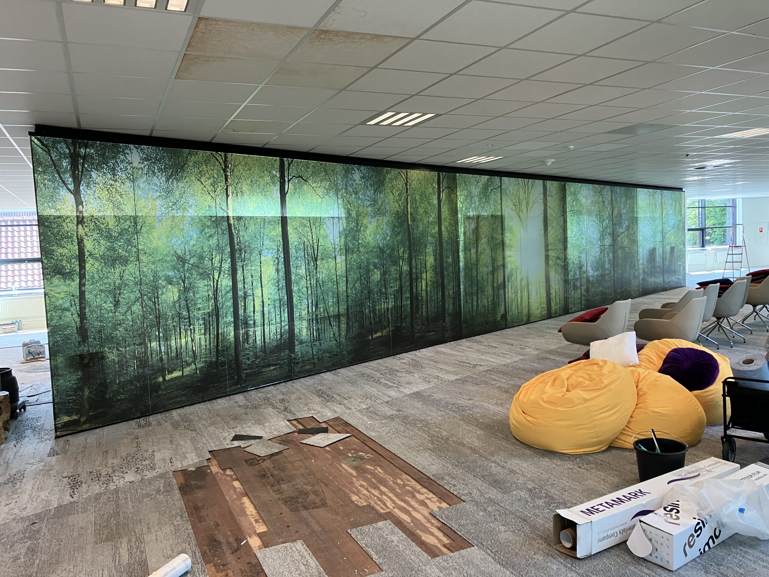 Er werden akoestische panelen gemaakt en opgehangen in de trappenhuizen en de gangen. Bij binnenkomst wordt u welkom geheten middels een akoestische wand, de teamkamer werd voorzien van een stoer naadloos behang en alle ramen werden in een geprinte mat glas folie geplakt om het aan de buitenzijde van het pand een eigentijdsere look te geven in een eenduidige uitstraling.