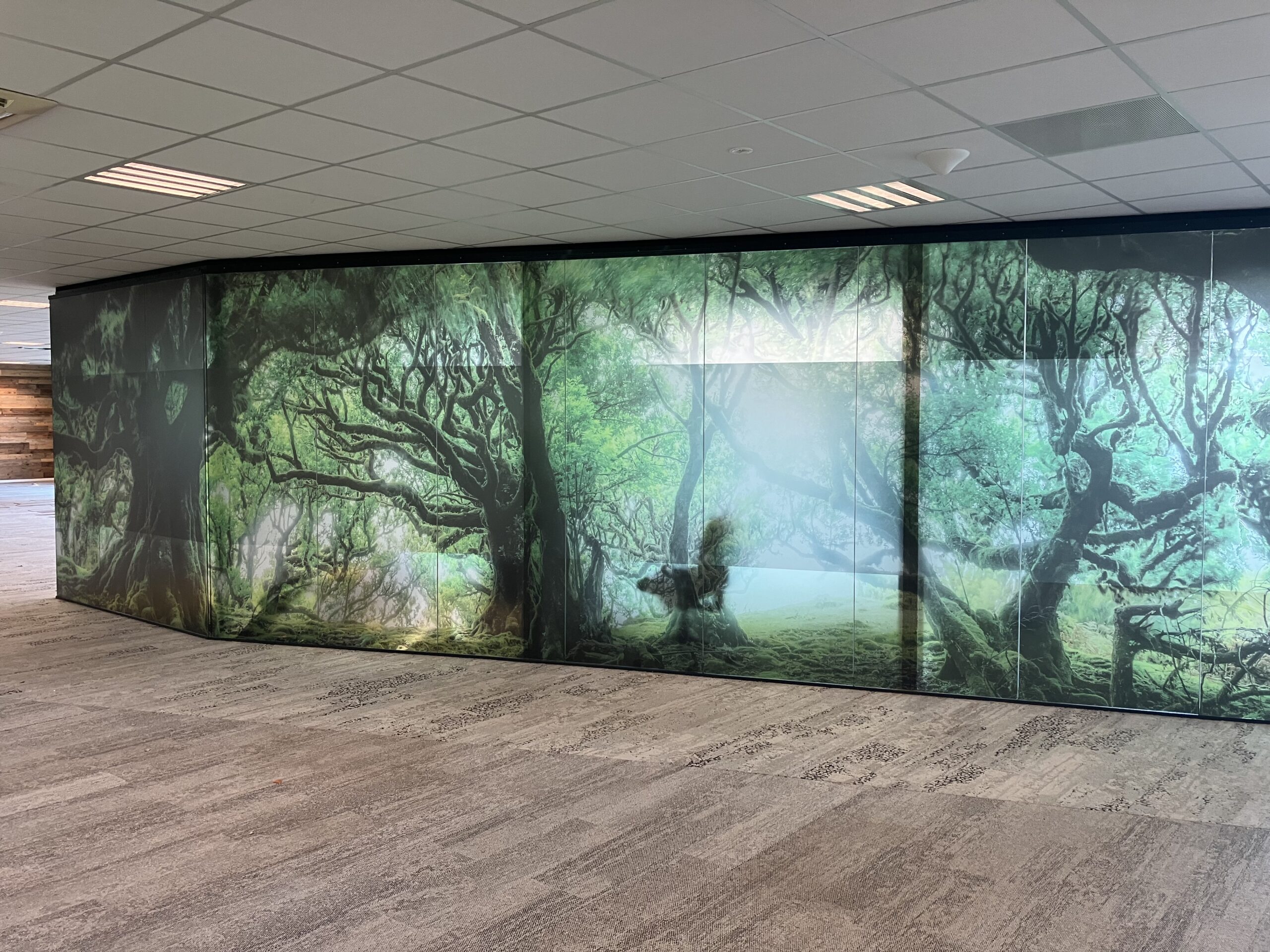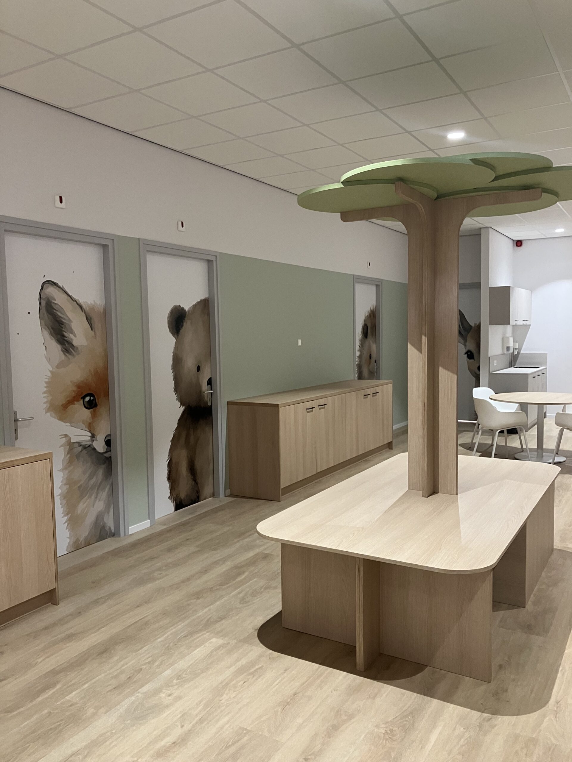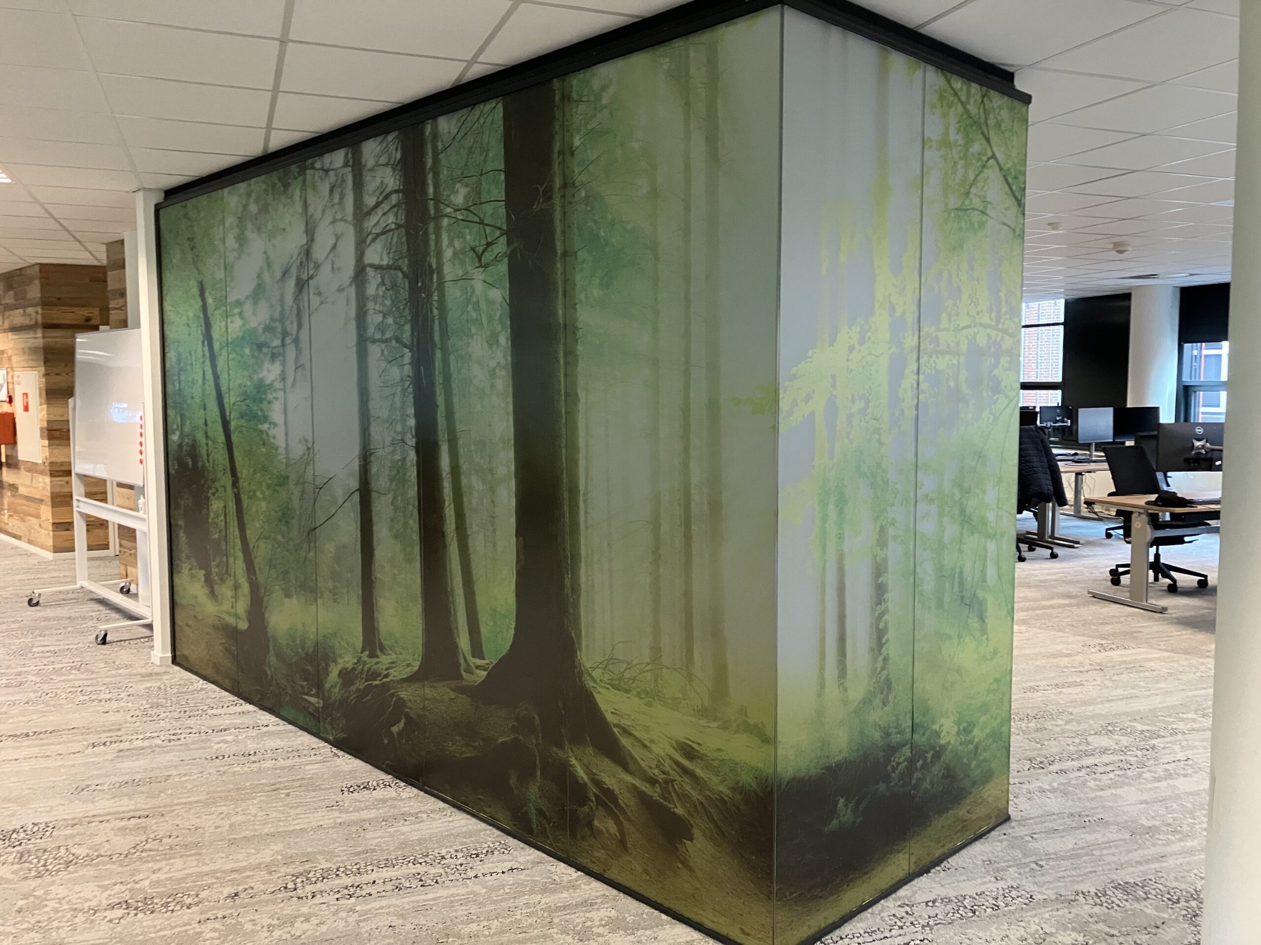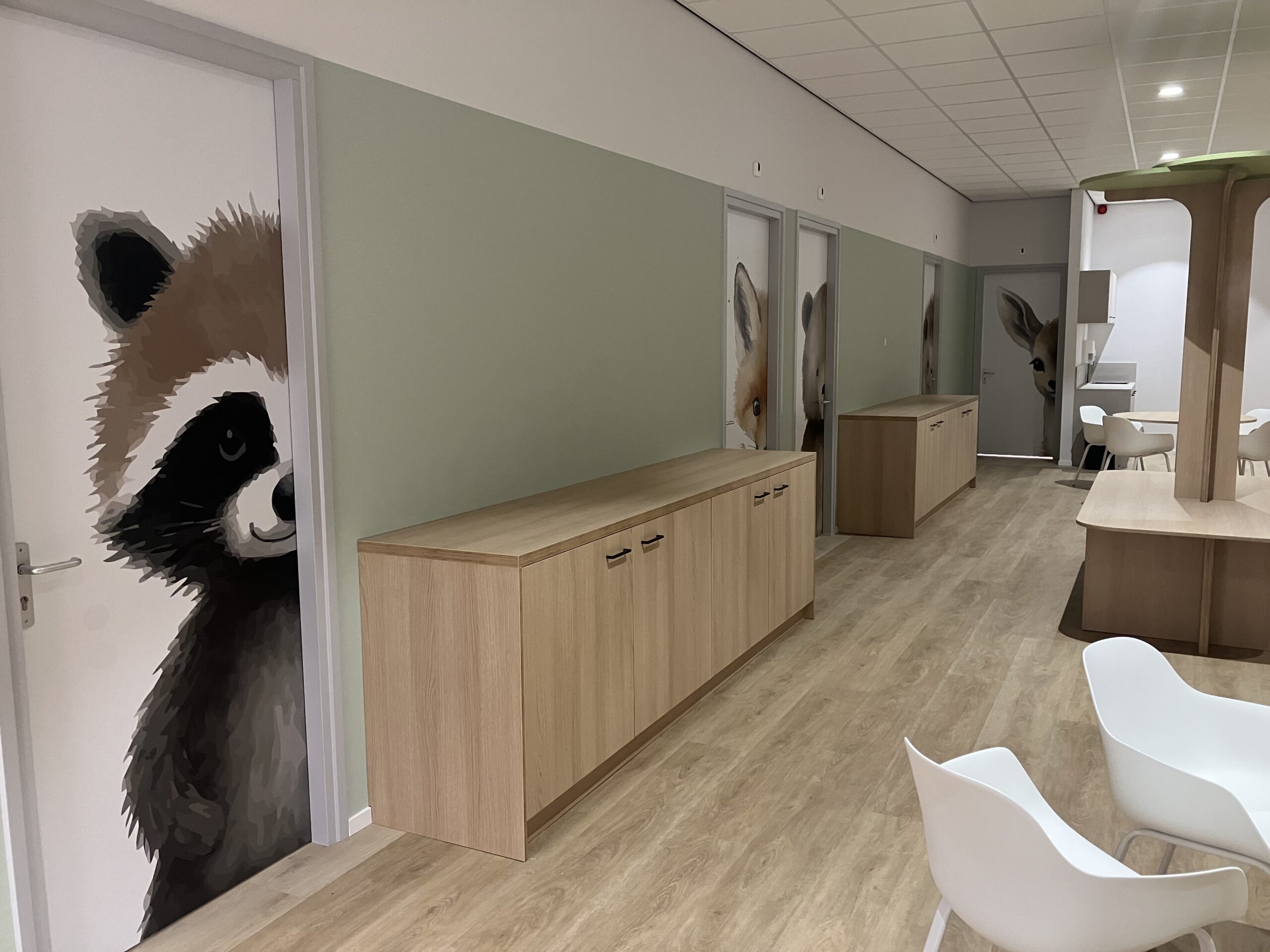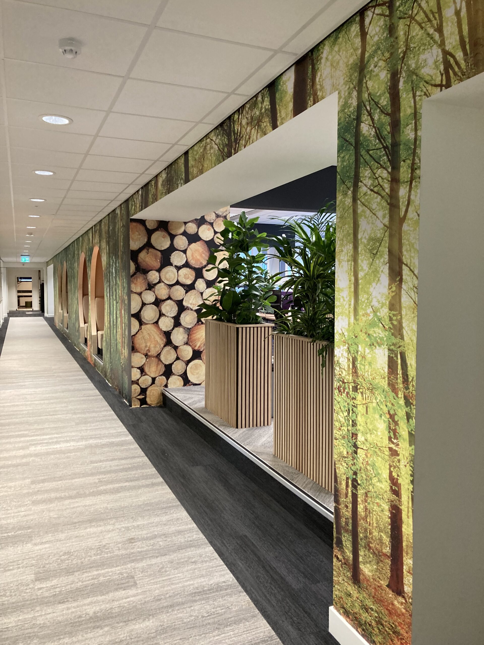 Er werden akoestische panelen gemaakt en opgehangen in de trappenhuizen en de gangen. Bij binnenkomst wordt u welkom geheten middels een akoestische wand, de teamkamer werd voorzien van een stoer naadloos behang en alle ramen werden in een geprinte mat glas folie geplakt om het aan de buitenzijde van het pand een eigentijdsere look te geven in een eenduidige uitstraling.