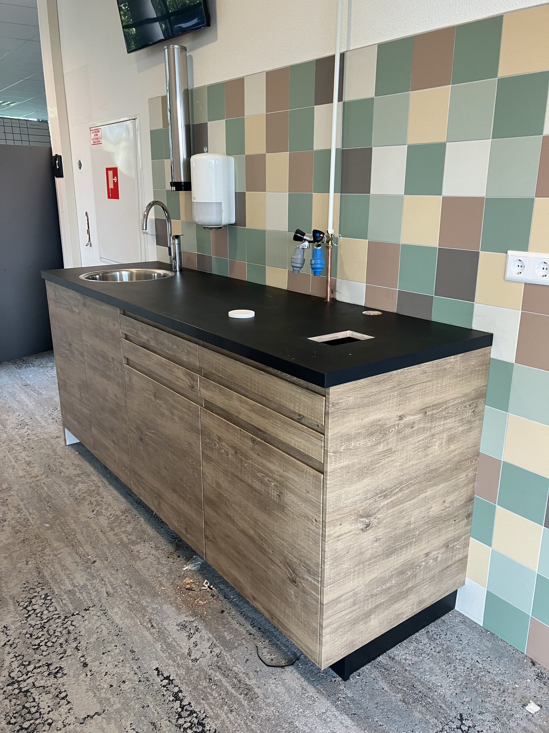 In 2015 werd Over de Tong geopend, hier beplakten we de vouwwanden voorzagen de ramen van belettering, beplakten de toiletten met retro posters uitgevoerd in naadloos behang, bij de kring maakten we van de witte wand rondom de bar een stoere betonprint uitgevoerd in naadloos behang.